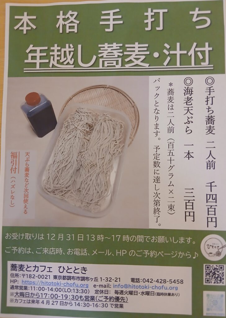 国産蕎麦粉を使い、機械は一切使わない本格手打ち蕎麦で、今年は年を越しませんか?二人前1,400円(汁付き)から承ります。海老天は一本からご注文いただけます。また、ハズレなしの福引付きです!1等は次回使える天ぷら蕎麦券(温・冷)となります。