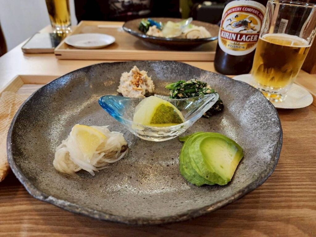 女将の手作りおつまみも多数用意しています。写真は惣菜盛り合わせ5種(700円)